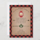 An outdoors themed birthday invitation featuring an illustration of a red camping lantern, a green maple leaf and an arrow. Background is card stock inspired over a red and black plaid. Opposite side is plaid. Look for coordinating items at Jill's Paperie.