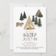 This cute camping theme boy's 1st/first birthday invitation features a white background with a tent, a bear, trees and mountains. The reverse side features a navy blue background with wood patterns. Personalise it for your needs. You can find matching products at my store.