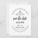 Simple line drawing art of a tent, arrow and geometric lines. Perfect save the date for a outdoor summer camp themed wedding. Congratulations to the happy couple.