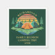 Create personalised paper napkins for a family reunion party organised in a camping theme. The design features a vintage sunset illustration with tents in a pine tree forest near a lake on a forest green background. The template makes it easy to customise the text with your last name and year.