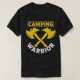 This design features a black t-shirt with the word "CAMPING" at the top and the word "WARRIOR" at the bottom. The letters are white and the design includes two yellow crossed axes.