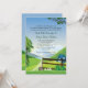 A serene landscape is the scene for this camping-themed wedding invitation. In the foreground, a rustic wooden fence holds the bride's veil and the bouquet lays in the grass. A few mason jars are placed next to the bouquet with two green backpacks for the bride and the groom next to them. A tent is pitched in the meadow behind the fence which looks out onto a mountain lake on a clear day. The reverse shows the same scene in closeup on a mason jar onto which is affixed a label with the event date or any other customised message. The couple's names print above. Great for a glamping, a rustic or any outdoor wedding. Available with matching products.