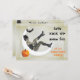A spooky frankenstein mama, complete with knee high black leather boots, rests against a silver crescent moon on the front of this campy, humourous Halloween party invitation. A black bat flies over, and a glowing orange jack o lantern sits at the bottom. The text, in black and orange, says Let's Kick up some fun at our Halloween Party! The back of the invitation holds your customised party text among three black bats. Fun!