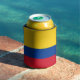 Colombian Flag Can Cooler, Vibrant Tricolor Design with Coat of Arms, Symbol of Colombian Pride and Heritage, High-Quality Materials, Durable Construction, Connection to Colombia, Authentic Colombian Souvenir