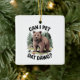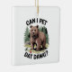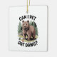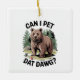 A whimsical illustration of a bear wearing a dog collar with a name tag, standing in a forested scene. The text above and below the bear humorously reads, "Can I Pet Dat Dawg?" A playful and creative design that combines humour and nature.