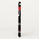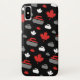 Cell phone case featuring a maple leaf and curling rock pattern in red, white and grey on black background. Perfect for curlers and curling fans.
