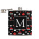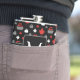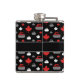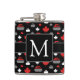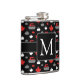 Flask featuring a maple leaf and curling rocks pattern in red, white and grey on black background. Customise with your initial. Perfect for curlers and curling fans.