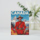 A striking and iconic vintage-style travel poster for Canada, featuring a proud Royal Canadian Mounted Police (RCMP) officer—the Mountie—in his classic red serge uniform. The backdrop showcases a rugged Canadian mountain landscape, including a lake, pine trees, and a distant castle. This bold illustration is perfect for lovers of Canadian history, national symbols, and dramatic retro travel art.