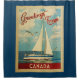 This Greetings From Canada vintage travel nautical design features a boat sailing on the water with seagulls and a blue sky filled with gorgeous puffy white clouds.