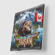 A Canadian beaver gathers twigs by the water, surrounded by lush greenery and a mountain backdrop, proudly displaying the maple leaf flag.