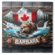 A Canadian beaver is swimming in a vibrant river, surrounded by mountains, greenery, and a Canadian flag backdrop during a sunny day.