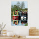 Canal boats, known in the UK as narrowboats, were originally used to transport goods around the country. They are now used mainly for leisure and attract people from all over the world to enjoy our rural countryside. These boats look very pretty with their brightly coloured cabins, traditionally blue, red or green. Flowers and castle designs also adorn the more traditional boats.
