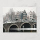 Photo postcard of a canal with a bridge, traditional houses and bikes under some snow in winter in the Dutch capital city, Amsterdam, the Netherlands with a fading white bar and the text 'Amsterdam'.