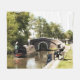 An art design of a narrowboat approaching a lock and a man fishing. Canal boats, known in the UK as narrowboats, were originally used to transport goods around the country. They are now used mainly for leisure and attract people from all over the world to enjoy our rural countryside. These boats look very pretty with their brightly colored cabins, traditionally blue, red or green. Flowers and castle designs also adorn the more traditional boats.
