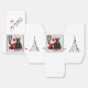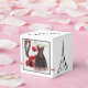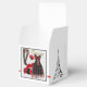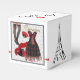 Square classic style favour box with an image of a black and red cancan dress, feminine legs clad in black striped thigh-high stockings, a black top hat adorned with red feathers, a red feathered boa, and a red feathered fan on a grey and white French traditional background. Black border. The sides have an image of the Eiffel Tower and “Ooh la la!” is printed in black French script on the top. See the entire Cancan Favour Box collection in the PARTY FAVORS section.