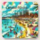 Pop art comic book style art scene of a beach with a vintage vibes. AI Art depicts people having fun on the beach shoreline with hotels and and apartments buildings in the background, pretty palm trees, colourful umbrellas and a gorgeous blue cloudy sky in Cancun, Mexico.