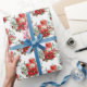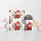 Wrapping paper with a pretty bouquet made with watercolors. Red candles with gold accents and a smaller white candle too. Surrounded by a pine bouquet with a poinsettia flower.
