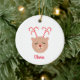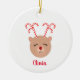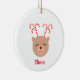 This Christmas ornament features an illustration of a Red Nosed Reindeer with candy cane antlers. The reindeer has long lashes and a sweet smile. The red nose is filled in with simulated red glitter (not actual glitter). Personalised this Christmas ornament with your name.