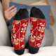 Christmas socks with a pattern of gingerbread man cookies in Santa outfits and candy canes on a red background.