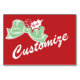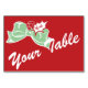 Decorate your Holiday or Christmas party with these customisable, retro style table cards featuring white writing, a green bow with holly berries and leaf accent on a red background.