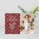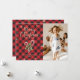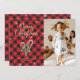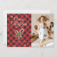 Custom photo Merry Christmas card featuring an elegant script font and Christmas candy canes, holly and red berries against a red buffalo plaid background on the front and snowflakes at the back. Easily personalise this red holiday card with your photo and text.