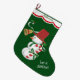 Here's a colourful snowman image personalised Holiday Stocking that will please any child! It features an adorable snowman wearing a top hat and carrying a red and white striped candy cane which is tied with a pretty green bow. Behind him is a white ribbon with holly and a gold bell. The images are placed on a dark holiday green background. Cute! Your child's name is in green on a white and red scalloped border at the top of the stocking. A second text field is on the toe; make it say whatever you'd like!