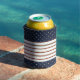 A basic striped pattern with a polka dot accents. This can cooler features a bold red line with thinner green line, on either side. This combination alternates with a hairline black rule and a thick white band. At the top and bottom of this design there's a block of navy, with gold coloured dots.