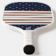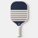 A basic striped pattern with a polka dot accents. This Pickleball Paddle features a bold red line with thinner green line, on either side. This combination alternates with a hairline black rule and a thick white band. At the top and bottom of this design there's a block of navy, with gold coloured dots.