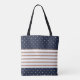 A basic striped pattern with a polka dot accents. This all-over-print-tote features a bold red line with thinner green line, on either side. This combination alternates with a hairline black rule and a thick white band. At the top and bottom of this design there's a block of navy, with gold coloured dots. The design is on both sides.