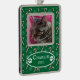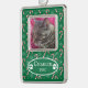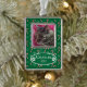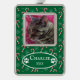 A green framed Christmas ornament with a candy cane and snowflake pattern , using a single photo of your cat . Add the kitty's name and year of Christmas you are celebrating together .