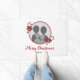 Festive round photo template design featuring Destei's original illustration of two red and white striped Christmas candy cane treats decorated with a red bow and a Christmas holly / Common holly plant. The photo is framed by a red colour border. There are also two personalizable text areas.