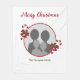 Festive round photo template design featuring Destei's original illustration of two red and white striped Christmas candy cane treats decorated with a red bow and a Christmas holly / Common holly plant. The photo is framed by a red colour border. There are also two personalizable text areas.