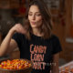 Brace yourselves, candy corn season is here! And if you're an addict like me, let's proudly display it with this Halloween slogan tee. This shirt is a fun and lighthearted way to let everyone know that you just can't resist those sweet and colourful kernels. So why fight it? Embrace the candy corn obsession and wear it with pride!