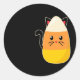 This Halloween costume features a bright yellow and orange jumpsuit with a hood featuring a cute cat face and candy corn accents. The hood also has two ears and a tail for a complete look. Perfect for any cat-loving trick-or-treater!