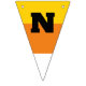 These triangle shaped bunting pieces have orange, yellow and white stripes to make them look like pieces of candy corn. Black letters spell out the message: HAPPY HALLOWEEN.