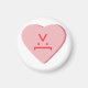 A pink candy heart that has devil face emoticon text.