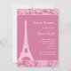 A beautiful, floral damask pattern accents the Eiffel Tower on this candy coloured invitation. It is shown on the basic paper; however, I recommend the weight an texture of the linen paper.