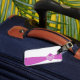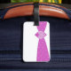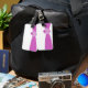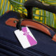 A classy tag for travelling featuring a candy pink ribbon with little heart accents.