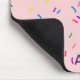 Colourful candy sprinkles on pink background with dripping pink frosting.