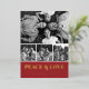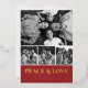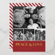 A warm and timeless holiday design featuring bold candy-stripe borders paired with a rich red message panel. The front layout highlights a large hero photo above a clean multi-photo strip, giving families plenty of space to showcase favorite moments. The elegant “PEACE & LOVE” greeting adds a classic festive touch, with customizable text beneath for your family name and year. Perfect for sending heartfelt wishes in a modern, polished style that stands out in every mailbox.