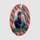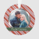 This holiday keepsake ornament features your own photograph within a pretty red and white Christmas candy stripe pattern frame which has an inside silver lining. A green banner holds your customised text; make it say whatever you'd like! The other side has the same stripe border with additional text on the white interior. An elegant keepsake gift for newlyweds or any couple.