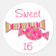 Pretty round sticker for a sweet 16 birthday party invitation. Graphics of pink, green, and white gaily wrapped pieces of candy against a white background, with pink custom text. Perfect as envelope seals to our Sweet sixteen girly birthday invitations.