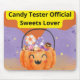 A fun, festive, and slightly spooky illustration perfect for Halloween. This design features a cheerful, smiling jack-o'-lantern candy bucket overflowing with a variety of classic sweets like lollipops, candy corn, and a chocolate-dipped treat. The warm orange and purple watercolor background, sprinkled with glowing fireflies, creates a magical "Trick or Treat" atmosphere. It's a sweet design for any "Candy Tester Official Sweets Lover" this spooky season!