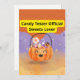 A fun, festive, and slightly spooky illustration perfect for Halloween. This design features a cheerful, smiling jack-o'-lantern candy bucket overflowing with a variety of classic sweets like lollipops, candy corn, and a chocolate-dipped treat. The warm orange and purple watercolor background, sprinkled with glowing fireflies, creates a magical "Trick or Treat" atmosphere. It's a sweet design for any "Candy Tester Official Sweets Lover" this spooky season!