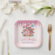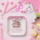 Sweet Celebration Candyland Kids Birthday party paper plates. Design featuring calligraphy script ''sweet celebration'' in trendy pink, candy house on a pastel pink background with colourful sprinkles. Personalise with a name and thank you message.
