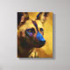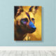 A digital painting that merges hyper-realism with bold, contemporary abstraction. This captivating portrait of a African Wild Dog showcases a harmonious clash of vibrant hues deep blues, golden ochres, and electric greens that breathe life into every fur strand and shadow. The textured, almost cubist brushstrokes add depth and movement, transforming a simple canine profile into a statement of raw beauty and emotional intensity.