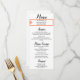 Personalised Menu options on front in black text against crisp white background. The Bride and Groom's Names and Wedding Date are highlighted in pretty cantaloupe colour frame. Backside has simple Monogram initials in cantaloupe text. Original Designs © TamiraZDesigns.