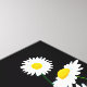 Wrapped canvas art is shown with a graphic print of pretty white daisies on a black background colour.