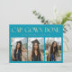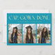 Modern and minimal graduation announcement photo card featuring 3 photos on the front and 1 on the back. The text at the top says "CAP. GOWN. DONE." Add the graduate's name, information, and message to personalize this card. Aqua blue color.