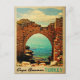 A vintage-look travel design featuring Cape Anamur Turkey. blue ocean and sky with stone ruins.